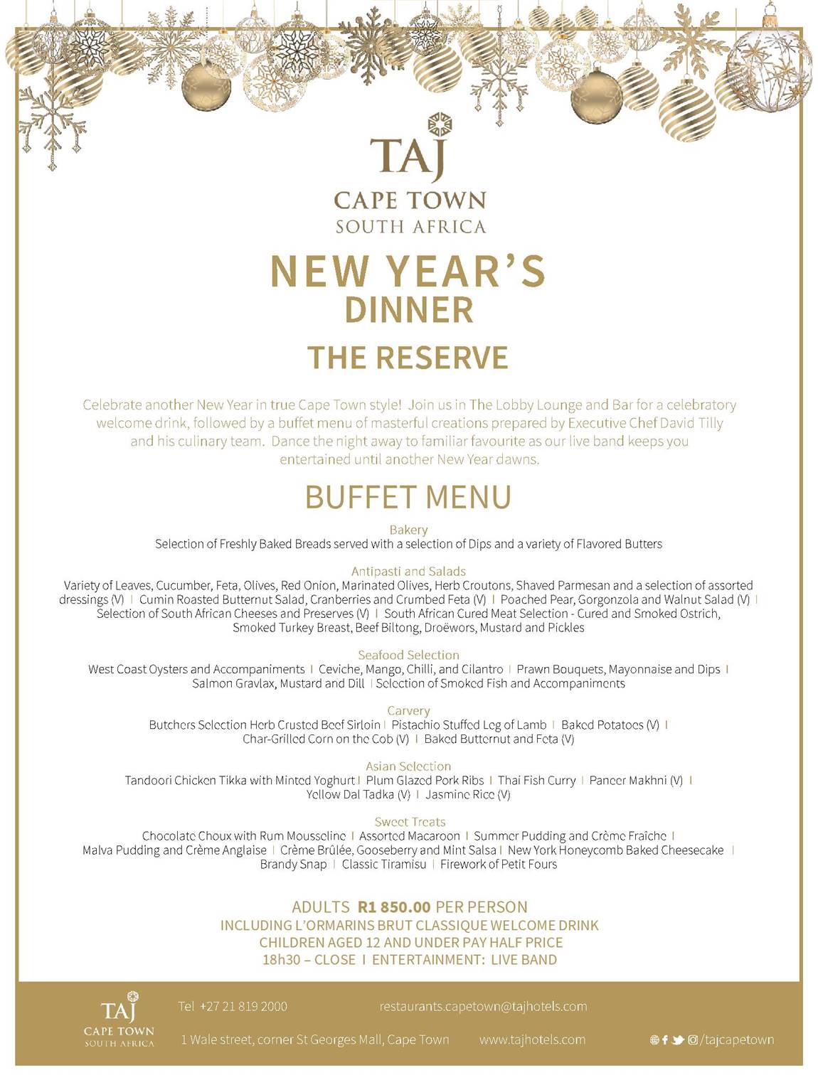 Join Taj Cape Town in The lobby Lounge and Bar for a celebratory welcome drink followed by a buffet menu of masterful creations prepared by Executive Chef David Tilly and his culinary team. Dance the night away to familiar favourites as a live band keeps you entertained until another New Year dawns.