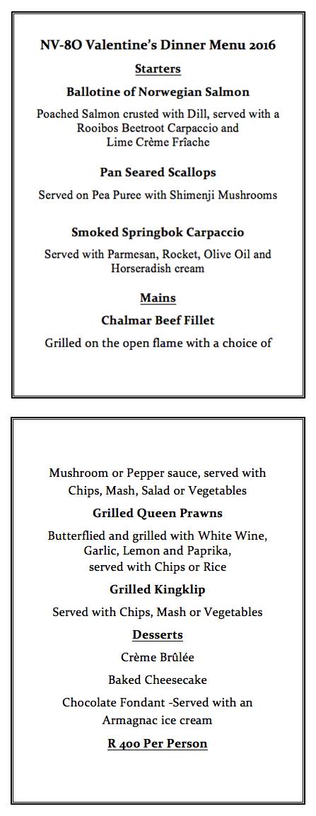 Artfully decorated by local interior designer Andrea Graff, the restaurant shares a Cuba meets colonial hotel dinning room ambience with bright lemon and teal hues set amongst tall palm trees. At NV-80, the aim is to be stylish with a laid-back attitude. The three course dinner costs R400 per person. For bookings please call 021 439 7112 or email info@nv-80.co.za