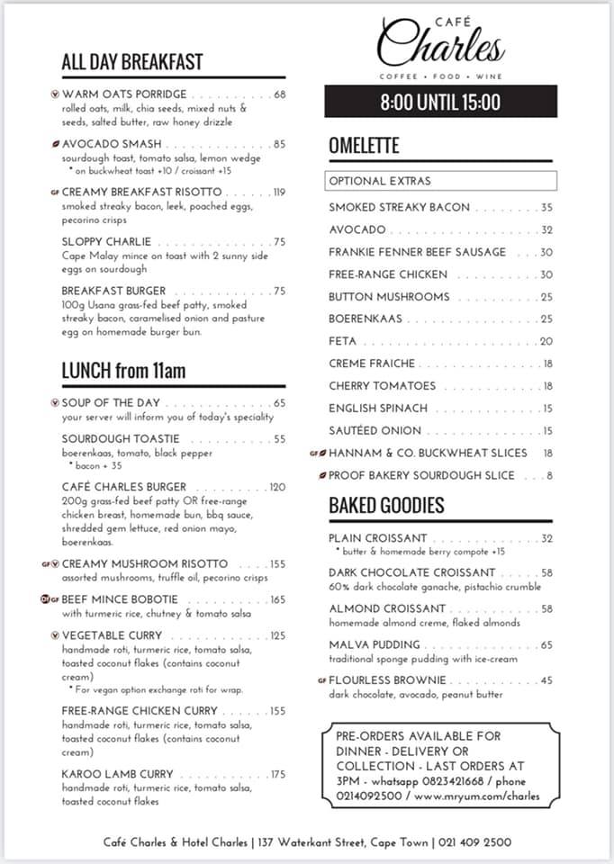 If you’re a little hungrier, you can order from the lunch menu, that includes all of the most popular dishes from Cafe Charles including the bobotie, the famous Cafe Charles burger, a delicious Karoo Ostrich salad and much much more.
