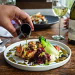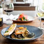 - West coast mussels | Franschhoek trout | white wine velouté | trout caviar | toasted ciabatta Petite Poussin beetroot port | root vegetables | confit tomato | parsnip & truffle gum | truffle pearls | spicy chermoula gremolata | chicken & sage jus