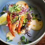 - pea purée | pickled ginger | salmon roe | brussels sprout leaves | ponzu-white wine sphere | Rooibos tea-vanilla sauce | micro greens | squid ink coral tuille
