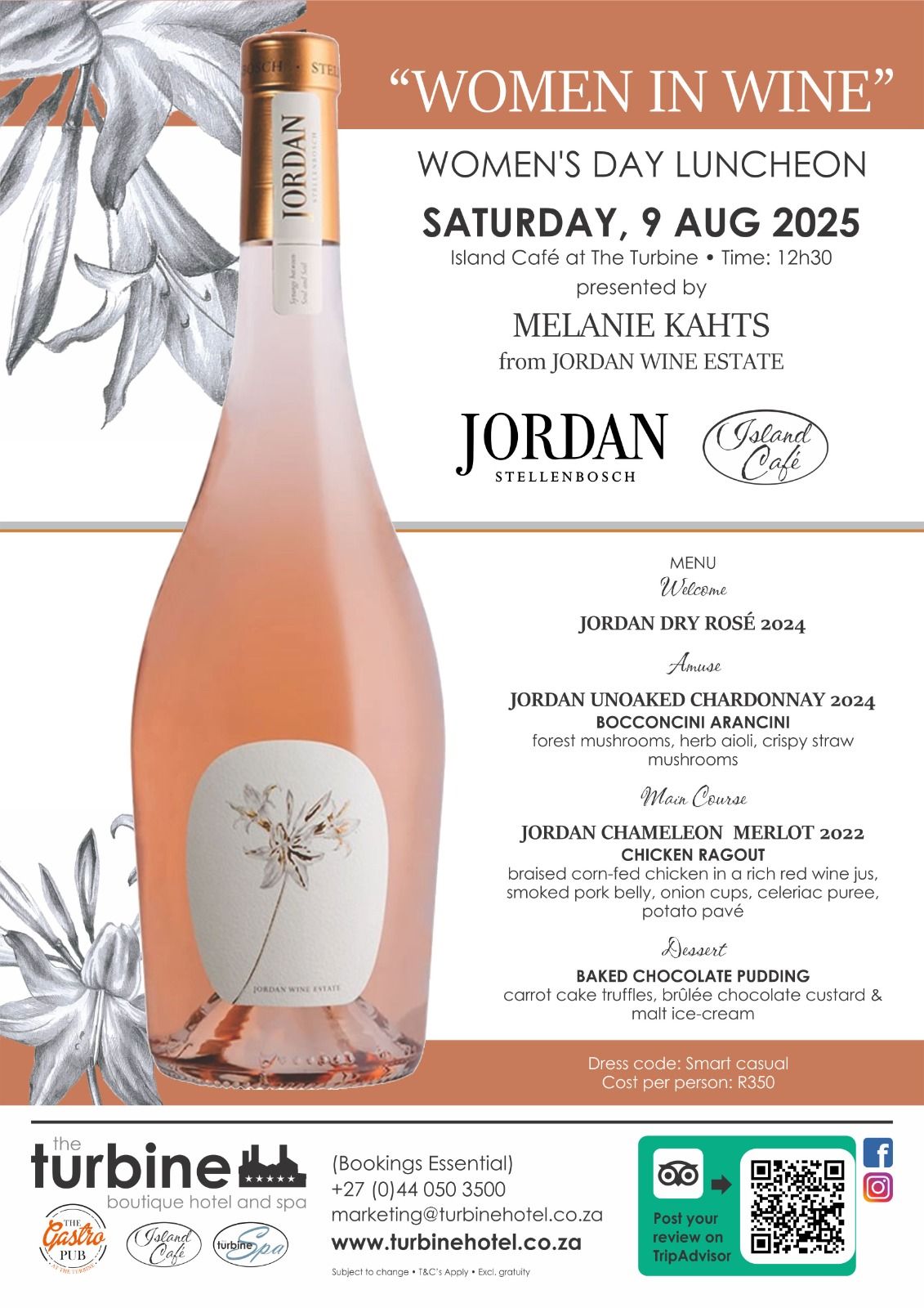 On Saturday, 9 August 2025, the chic, waterside restaurant at the Turbine Hotel & Spa is hosting a Women’s Day Luncheon in partnership with Jordan Wine Estate—and it’s the perfect excuse to turn your long weekend into a Garden Route getaway.