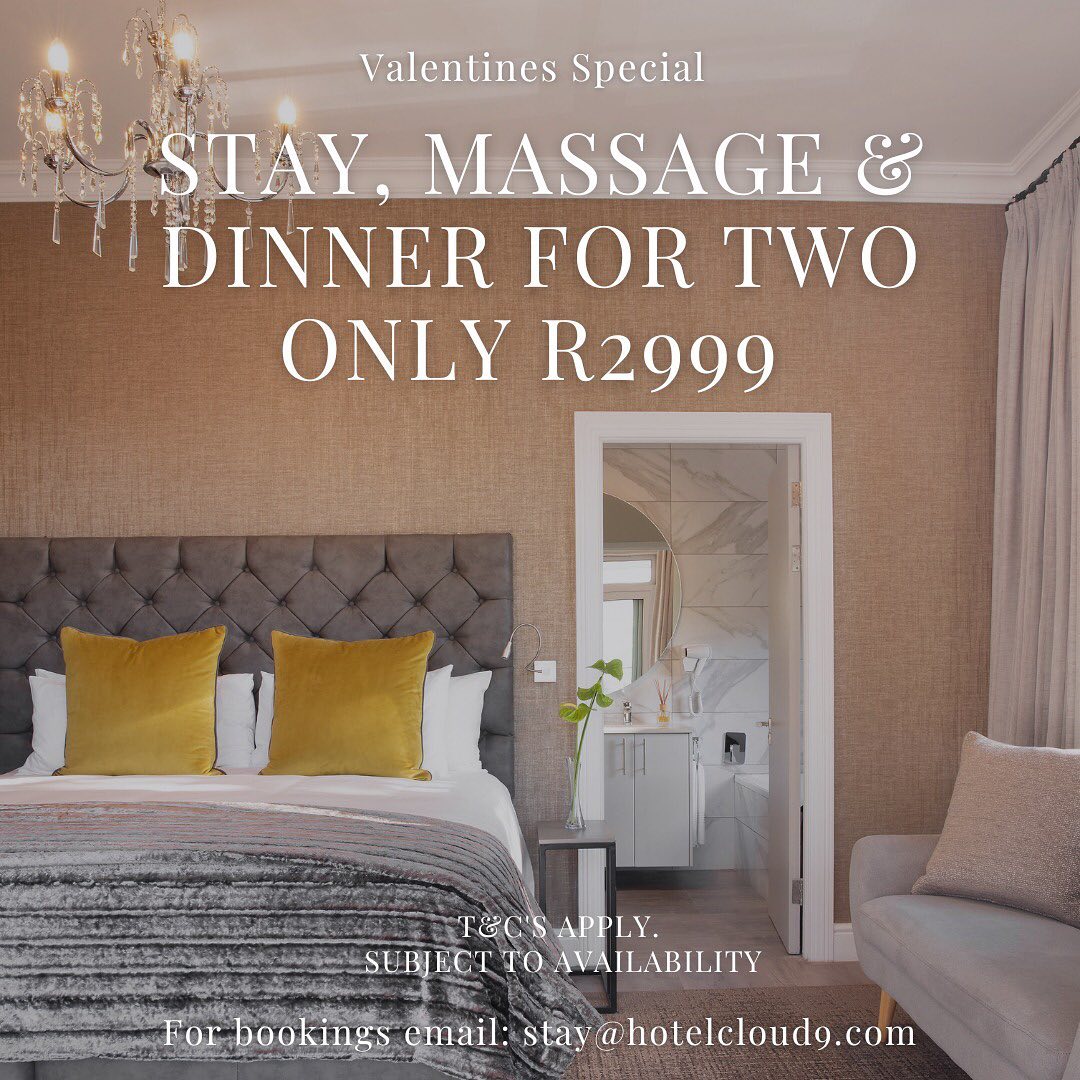 Cloud 9 is offering a special Valentine’s Day package that includes a night’s stay for two, a couple’s massage, and a R500 Mountain Club voucher for their Valentine’s Day menu, all for just R2999.