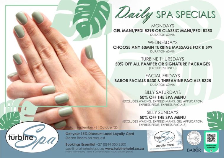 These exclusive spa specials at The Turbine Hotel are valid from September 1st to October 31st, 2023. Don’t miss your chance to experience midweek bliss and weekend relaxation at this charming Knysna retreat.