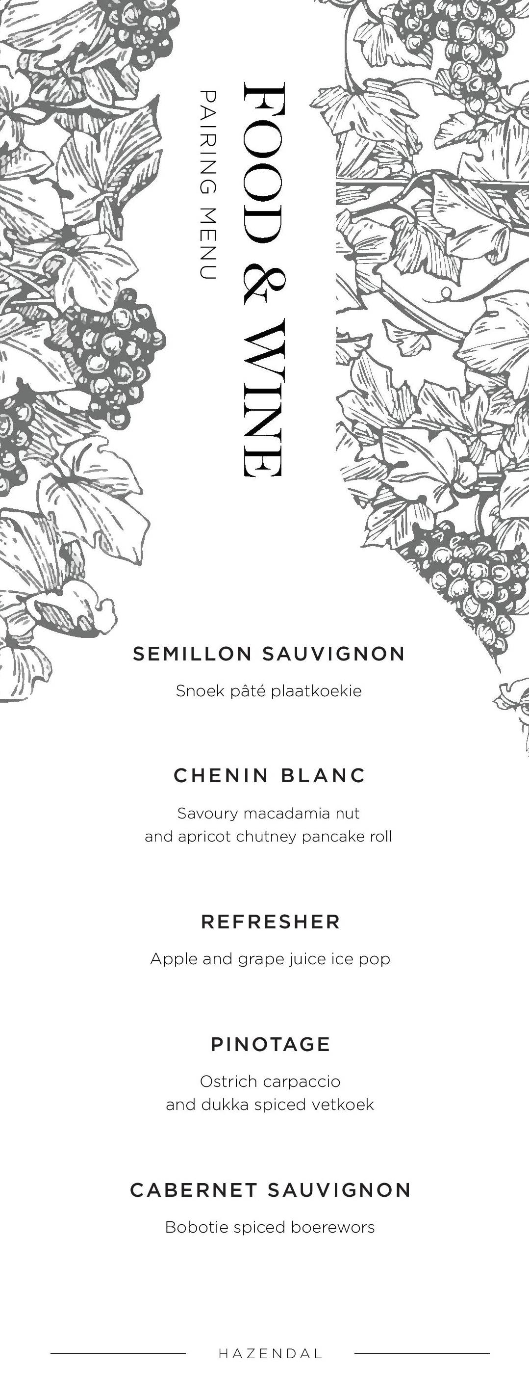 - An apple and grape ice pop palate cleanser is enjoyed before the third course of ostrich carpaccio and dukka spiced vetkoek is served with a Hazendal Pinotage. This truly South African wine boasts smoky, seductive notes and prominent red fruit aromas which pair beautifully with venison.