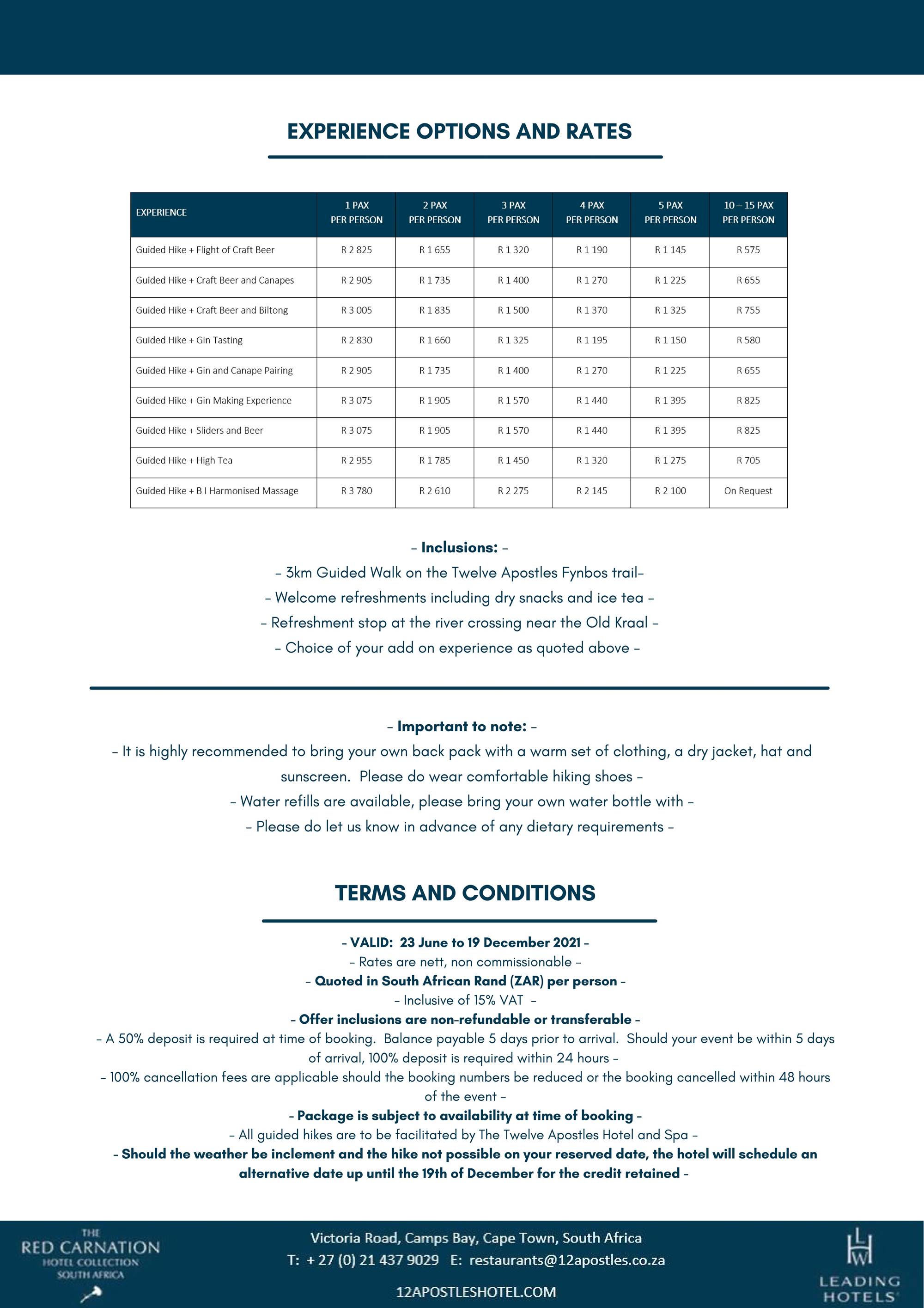 Guests will arrive at reception at the Twelve Apostles Hotel & Spa where they will be met by their guide who will then escort them through to the Café Grill. Here you will enjoy dry snacks and ice tea before the 3km hike commences which will take approximately 60min. At the River crossing guests will enjoy dry snacks and a refreshing drink. Guests will then be escorted back to the Café Grill, where they will be met by a 12A representative to escort them through to the appropriate f&b outlet (or spa) in order to enjoy the final part of the full experience.