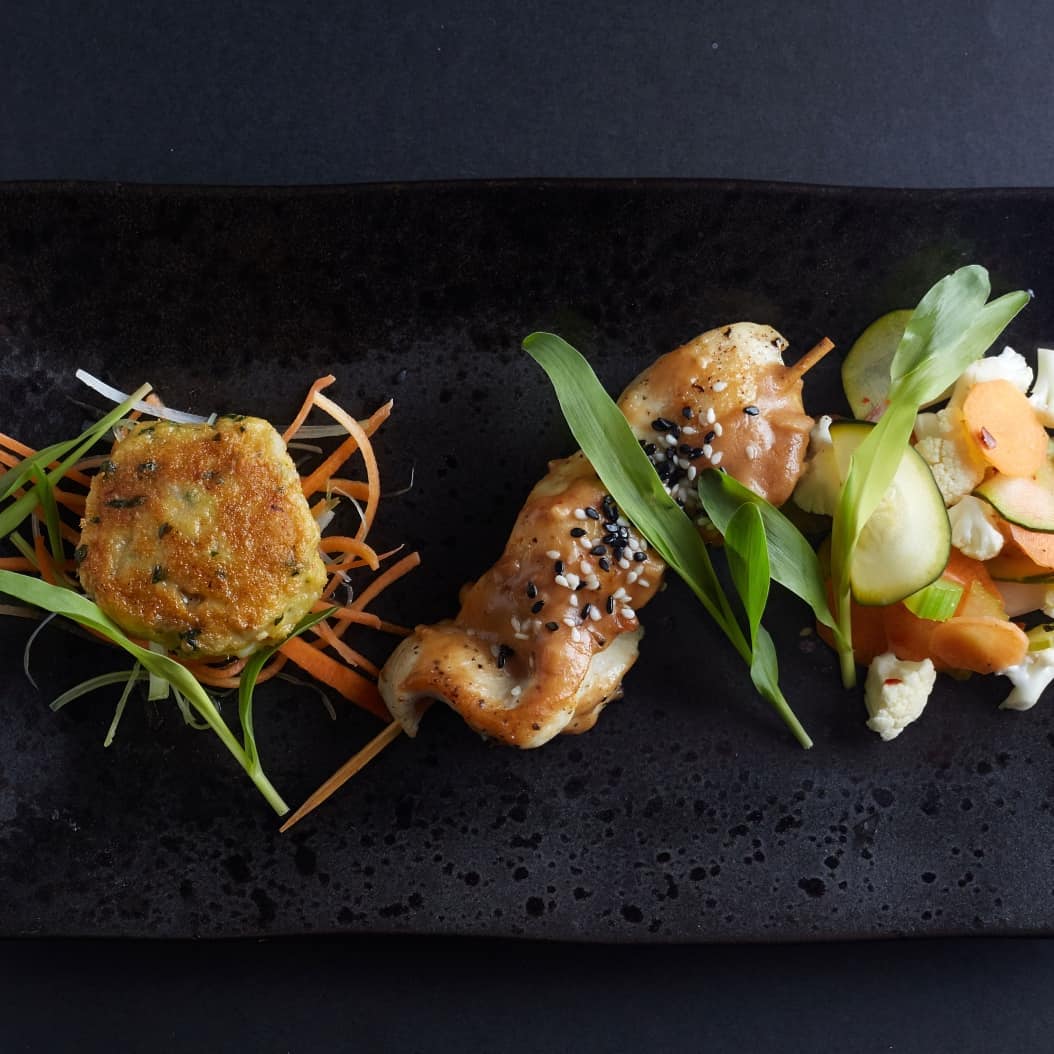 Thai Fish Cakes with Gyoza Dipping Sauce, Long Pin Sesame Chicken with spiced Satay Sauce and Pickled Vegetables with Ginger and Chilli. Paired with a tall glass of ice-cold Newlands Spring Passionate Blonde Craft Beer.
