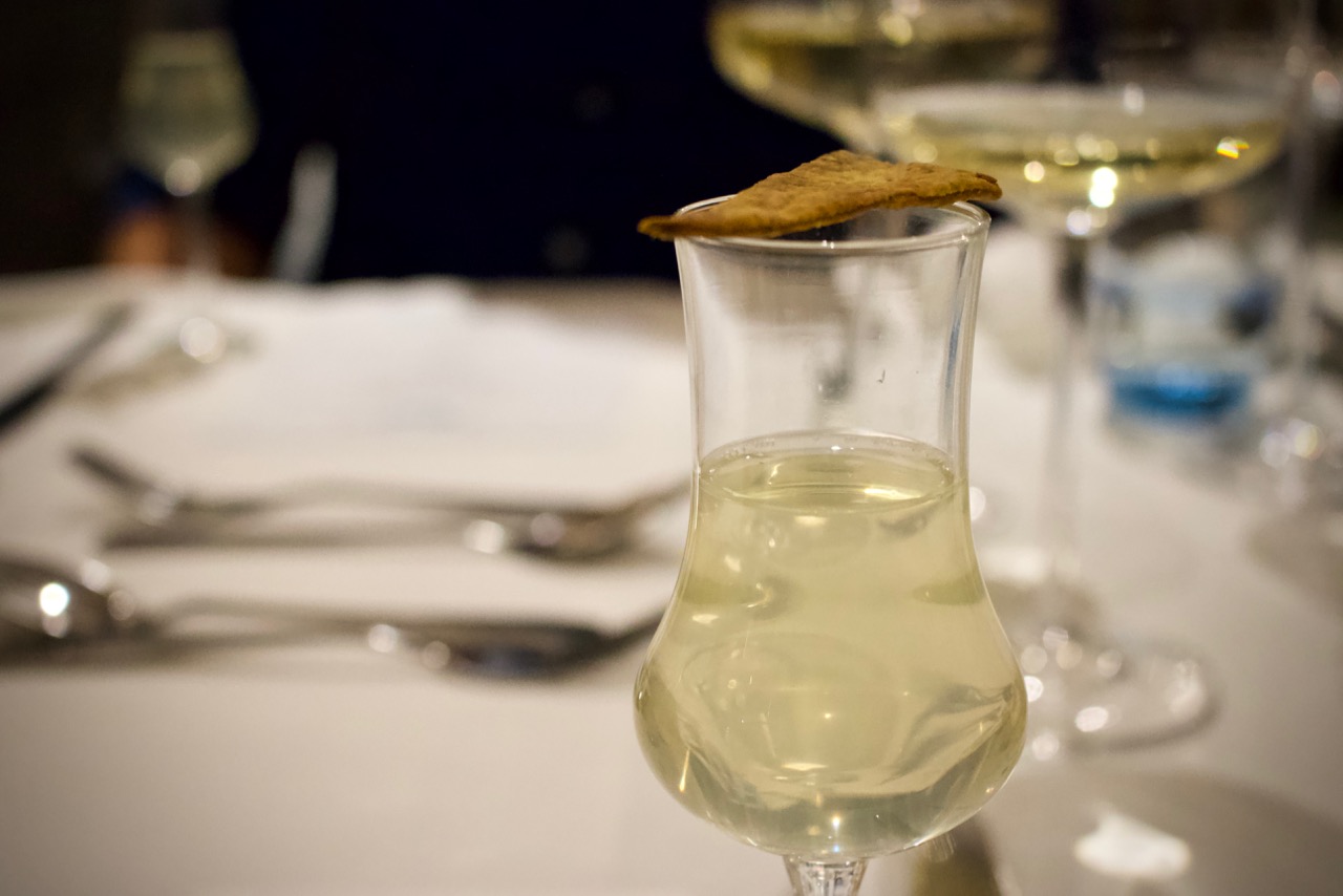 Now, the Palate Cleanser was something special. A Virgin Mary Consommé, the liquid placed before us had an almost entirely clear colour, yet flavour-wise, it packed a surprizing punch. It was quite simply delicious, exactly like a Bloody Mary minus the booze, delicate yet memorable.