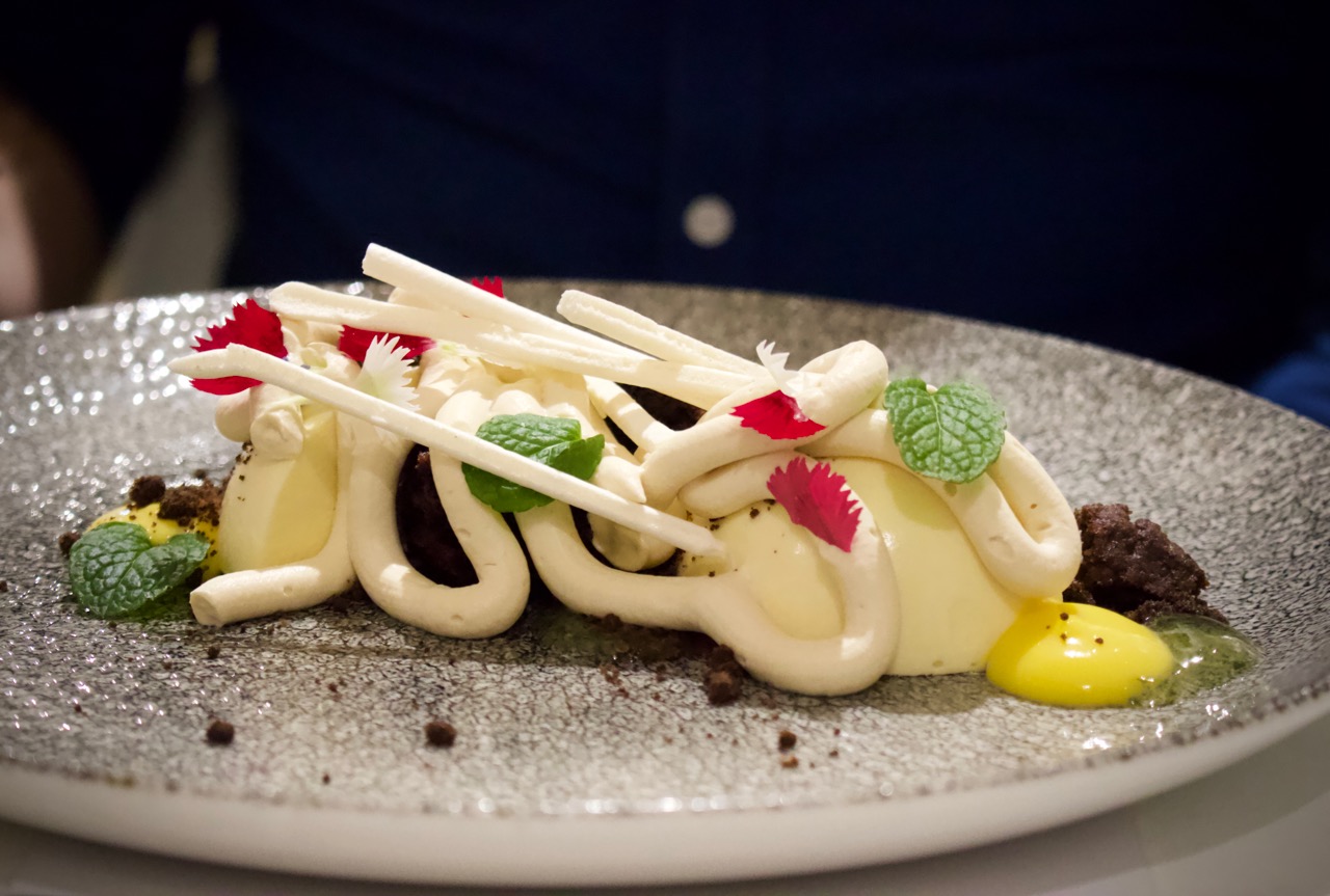 The dessert was something magnificent, beautiful to behold, it was a celebration of passionfruit, meringue and chocolate. Although at first glance it looked like it may be a sugar overload, it was perfectly balanced. Made up of crisp sticks of meringue with just the right amount of sweetness, parfait spheres, chocolate brownie crumbs, marshmallow piping and passionfruit gel. With every individual element complimenting the rest, each spoonful was a treat.