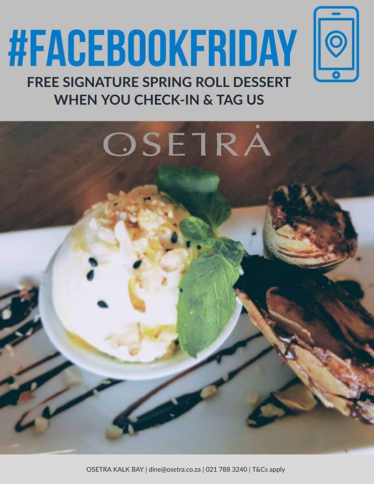 If you have lunch or dinner at Osetra on a Friday, check in on Facebook, tag them and receive an Osetra signature spring roll dessert on the house with this fantastic restaurant special. It’s the one time we’ll excuse you for being that person.