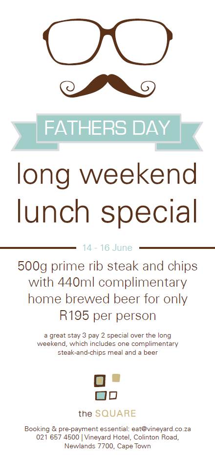 On Father’s Day, the Square Restaurant at the Vineyard Hotel are offering a lunch special for the entire long weekend (14 – 16 June 2014). Receive a 500g prime rib steak and chips with a 440ml complimentary home brewed beer for only R195.