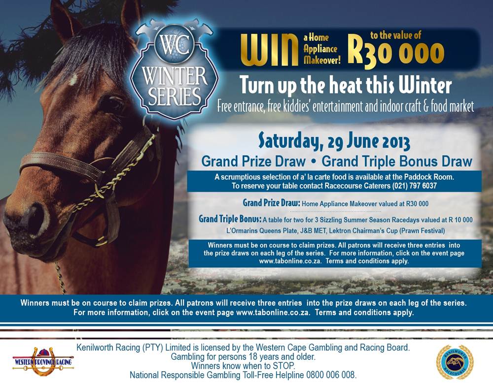 The final leg of the Western Cape Winter Series gets underway this Saturday 29 June at Kenilworth Racecourse. It’s a great excuse to make the most of the Winter sunshine with family and friends and soak up the thrilling trackside action and stand a chance to win huge prize giveaways on the day.