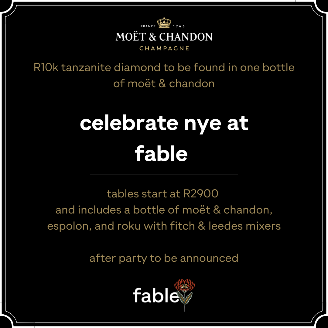 This year might have been rough, but we found the diamond in it. More specifically, a Shimanksy tanzanite diamond valued at R10k that will be hidden in one lucky bottle of Moët & Chandon to be found during the NYE celebrations at fable cape town.