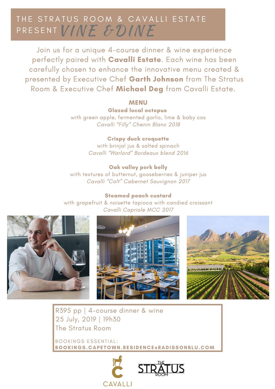 And some good Cavalli wine! Join other discerning palates for another wine and dine evening on the 25th of July with a fabulous 4-course meal and wine pairing with Cavalli Wines. The cost is R395 per person and gives you this amazing menu: