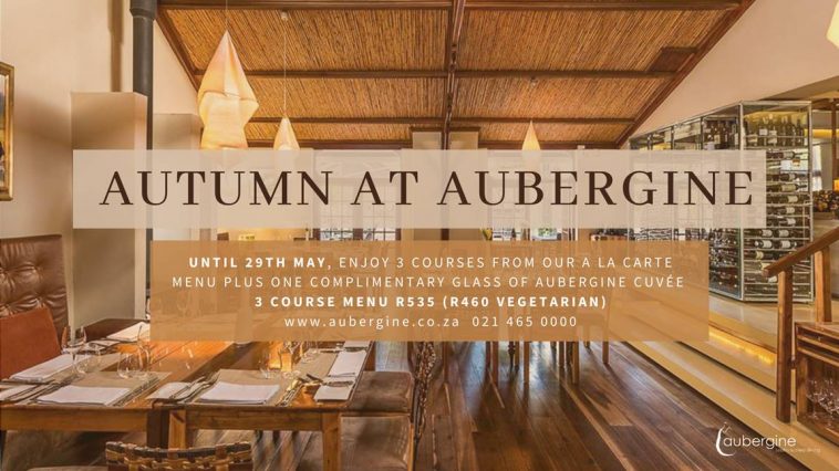 Until 29th May, you can choose any starter, main course and dessert from the A la Carte Menu at R535 (or R460 vegetarian) for 3 courses and enjoy one complimentary glass of Aubergine Cuvée.