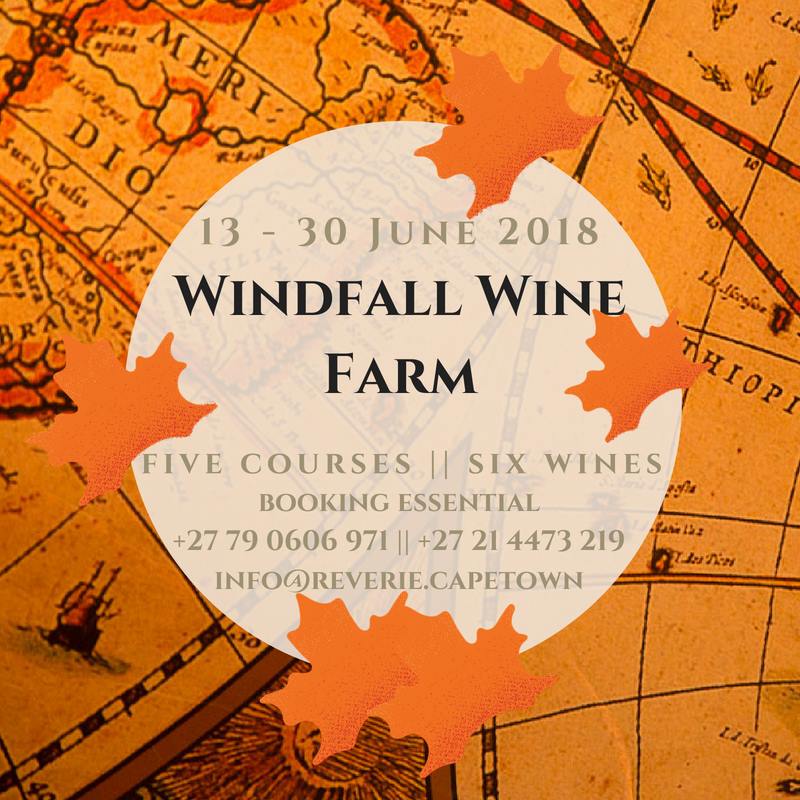 From 13 June – 30 June, the wines of Windfall will be on show at the dinner evenings at Reverie where you can enjoy five courses paired with six excellent wines.