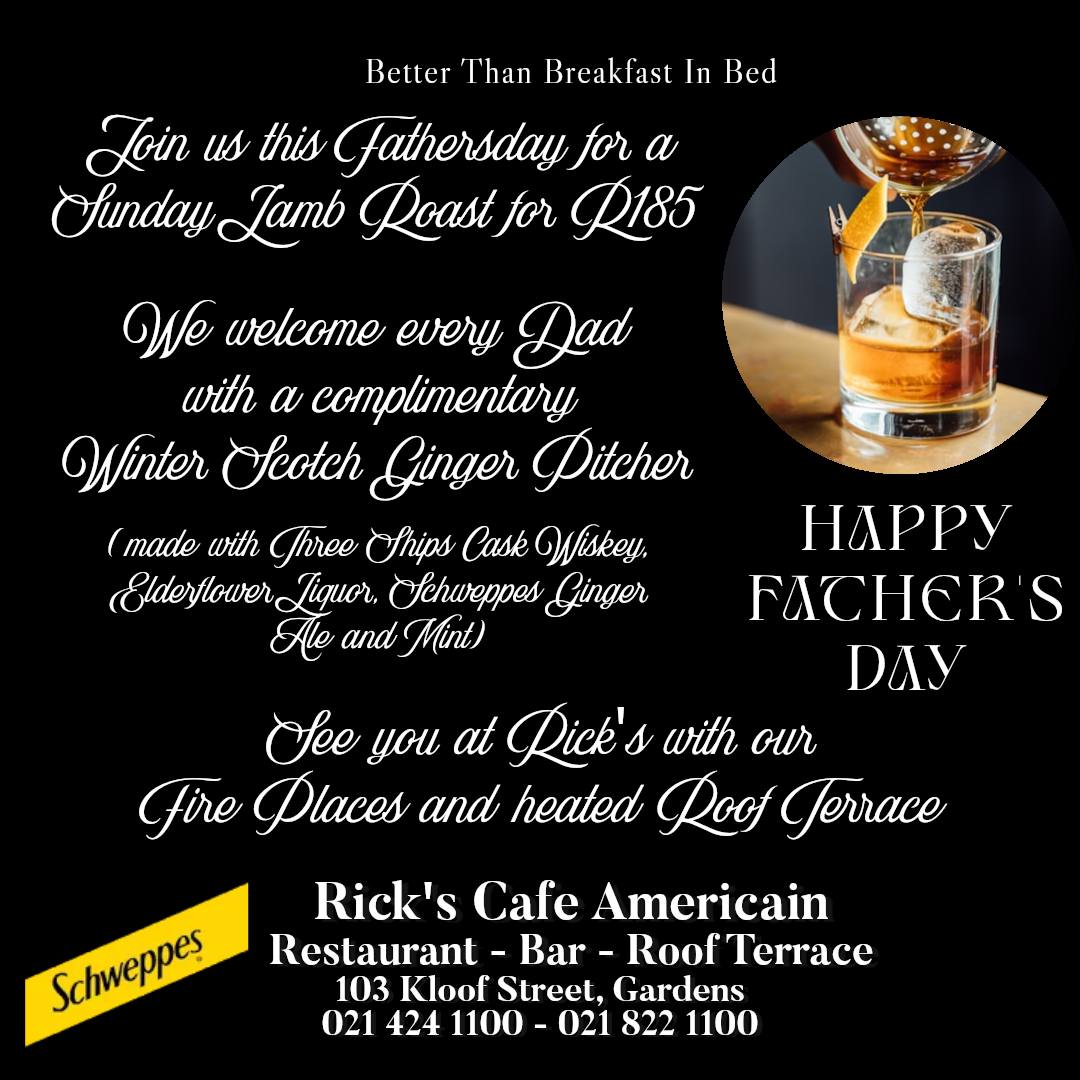 This Father’s Day, skip the slippers and treat Dad to something better than breakfast in bed — a sizzling Sunday Lamb Roast at Rick’s Café Américain for just R185, complete with cozy fireplaces and a heated rooftop terrace.