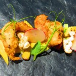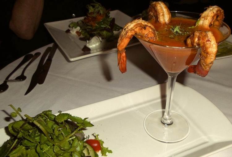 Four spicy balsamic, lemongrass and chilli marinated prawns, set delicately atop a Bloody Mary. Wait, what!? Yup, in the glass is a fiery tomato and celery cocktail. The “cocktail” was delicious, as was the flavour of the prawns, but I didn’t like that the prawns were cold.