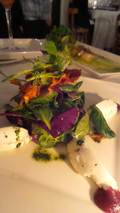 The pears were perfectly poached with elachi seeds (cardamom) and were sweet and firm. The peppery baby greens complemented the oh-so-creamy peppered goats cheese, while butternut crisps gave crunch and the sweet red onion gel gave richness. It was the most delicious, simple balance of flavours that worked magically together.