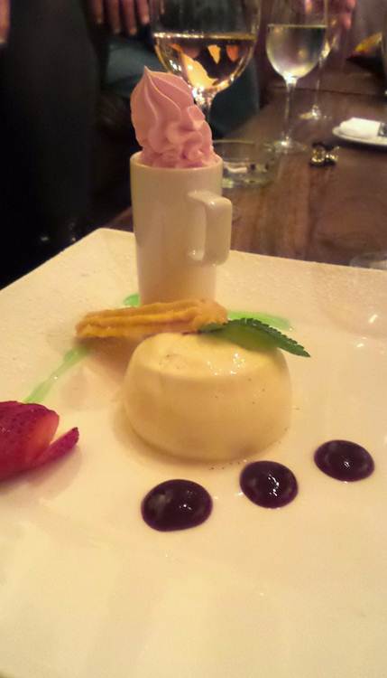 Oooh, I love pana cotta. In very simple terms, it is a cream-based jelly and is oh so delicious. Vanilla and cinnamon is always a delicious combination, which went well with the very cute, pink strawberry cream and sugared biscuit.