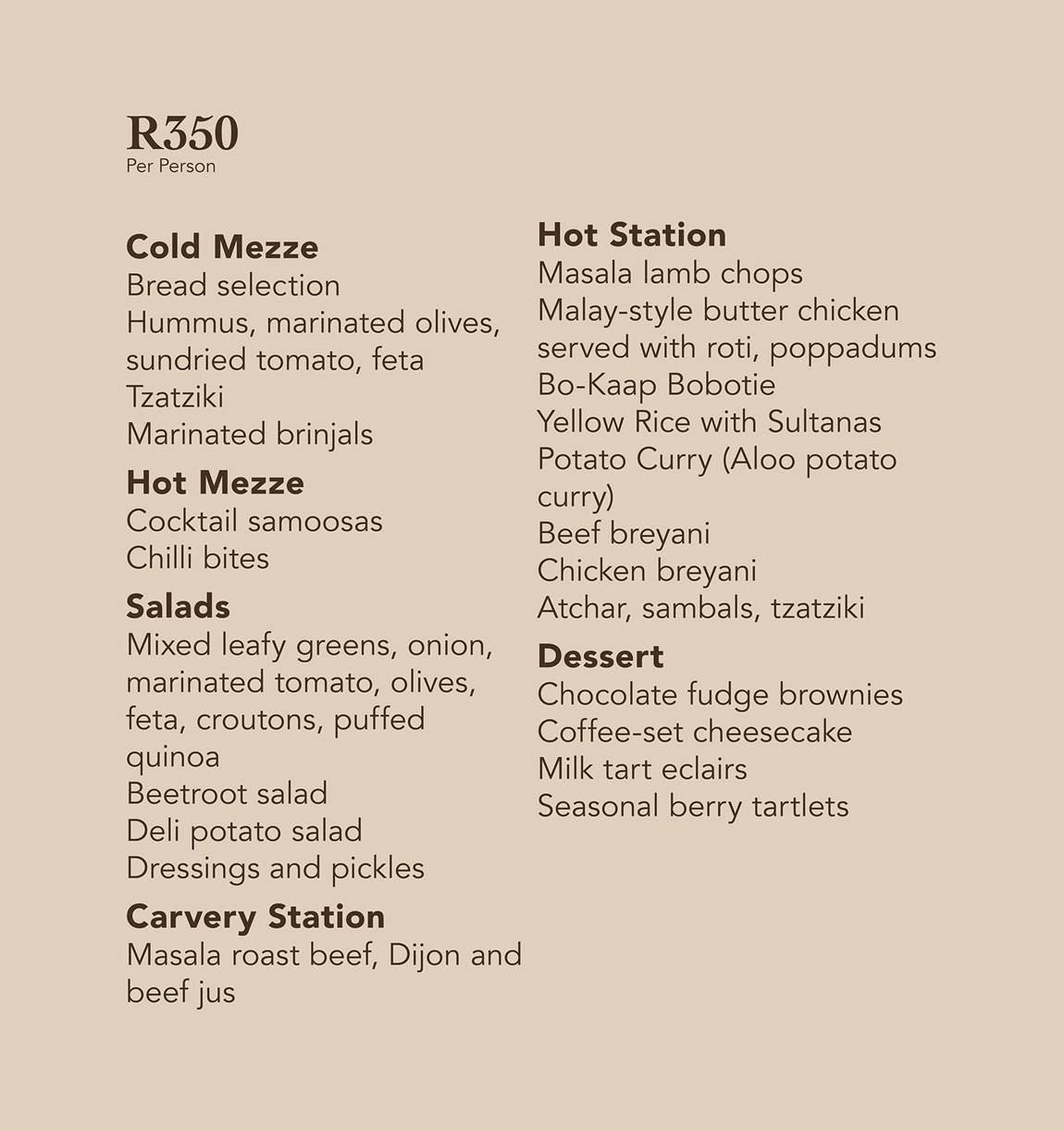For just R350 per person, guests are invited to indulge in a Cape Malay Buffet that blends comfort food with culinary heritage.