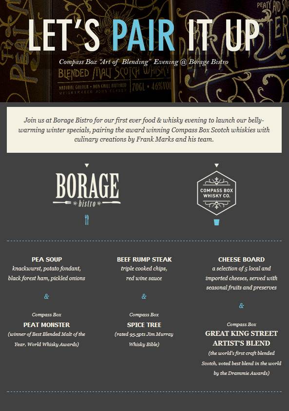 Join Borage Bistro for their first ever food & whiskey evening to launch their belly-warming winter specials. Award-winning Compass Box Scotch whiskies will be excellently paired with culinary creations by Frank Marks and his team at Borage Bistro.