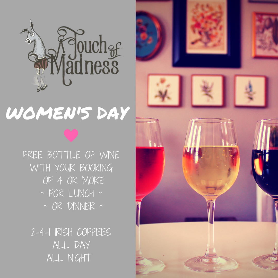 Celebrate Women’s day at A Touch of Madness and enjoy a complimentary bottle of wine for any table of four or more!