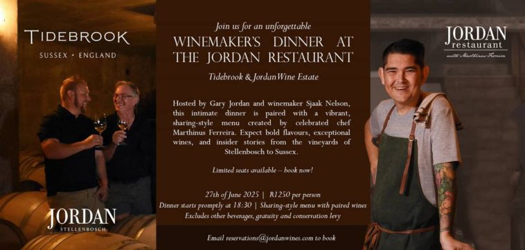 Hosted by none other than Gary Jordan and winemaker Sjaak Nelson, the evening pairs Jordan Wine Estate’s iconic vintages with a special sneak peek of Tidebrook wines from Mousehall Estate in the UK — and get this: Tidebrook isn’t even available in South Africa yet.