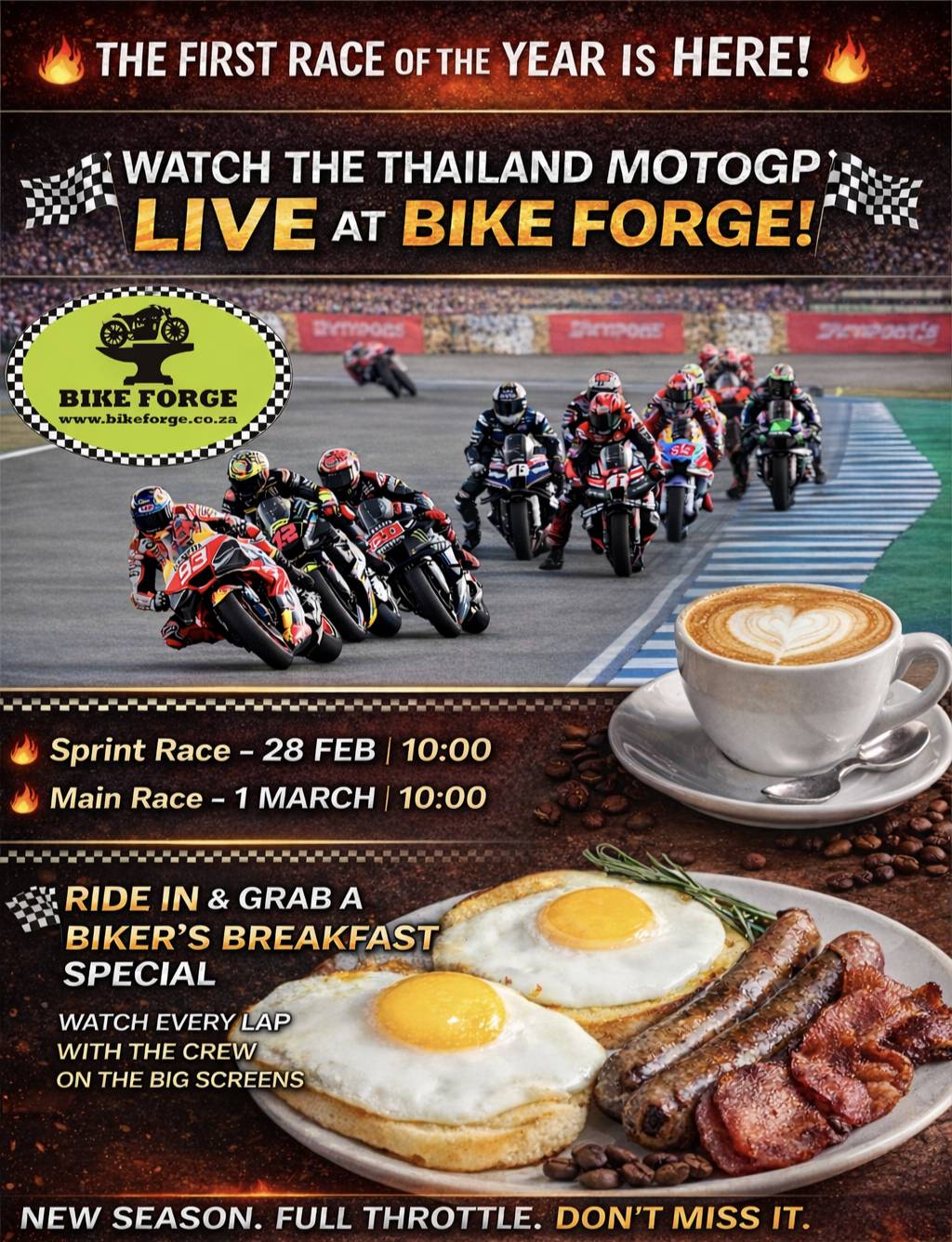 Bike Forge is kicking off the new season in true biker style by screening the Thailand MotoGP LIVE on the big screens, bringing every overtake, corner battle and podium celebration straight to the heart of De Heuvel Estate.