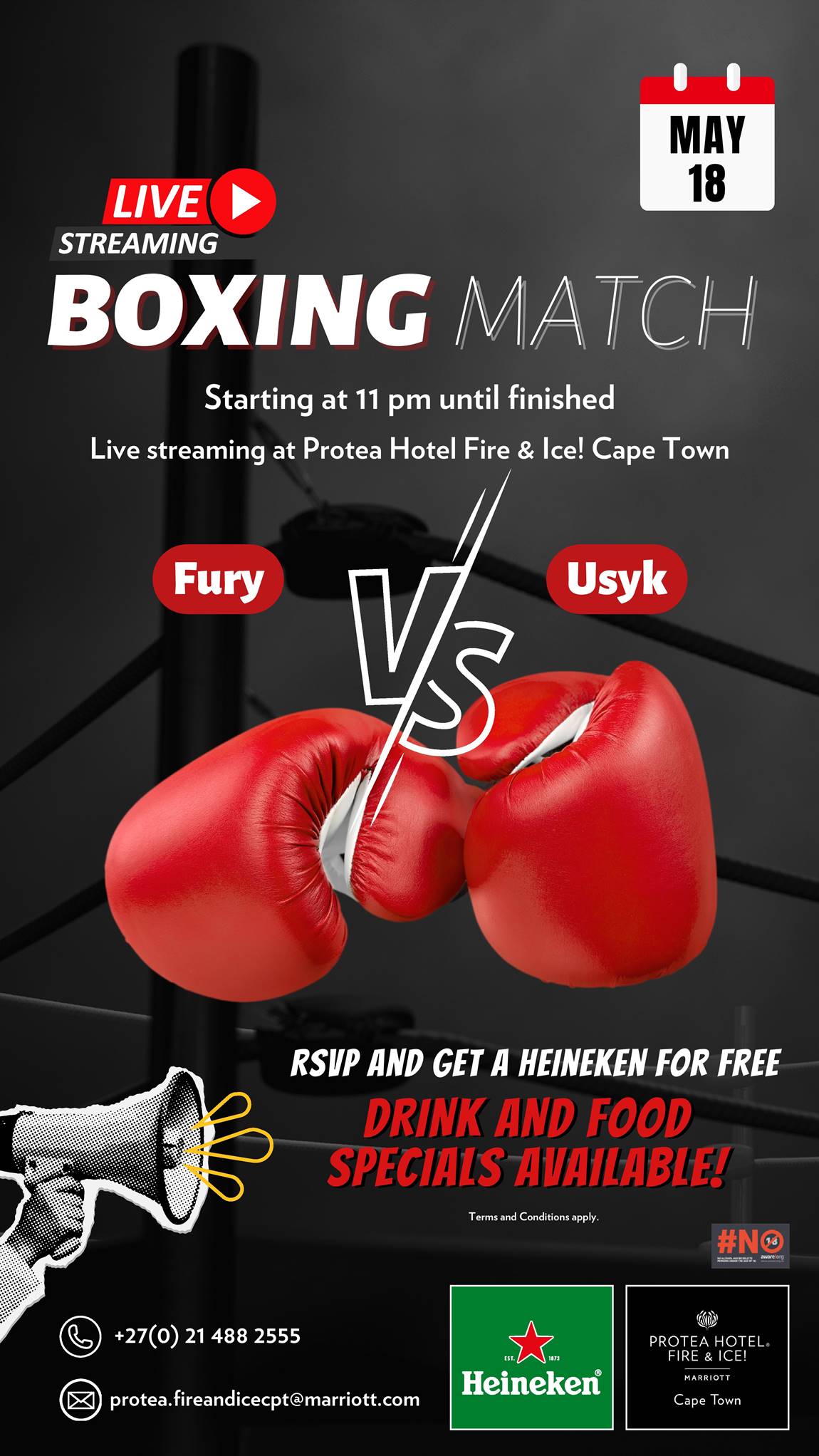 On May 18th, the Protea Hotel Fire & Ice! in Cape Town by Marriott Cape Town invites boxing enthusiasts to experience the thrilling live streaming of the Fury vs. Usyk match.