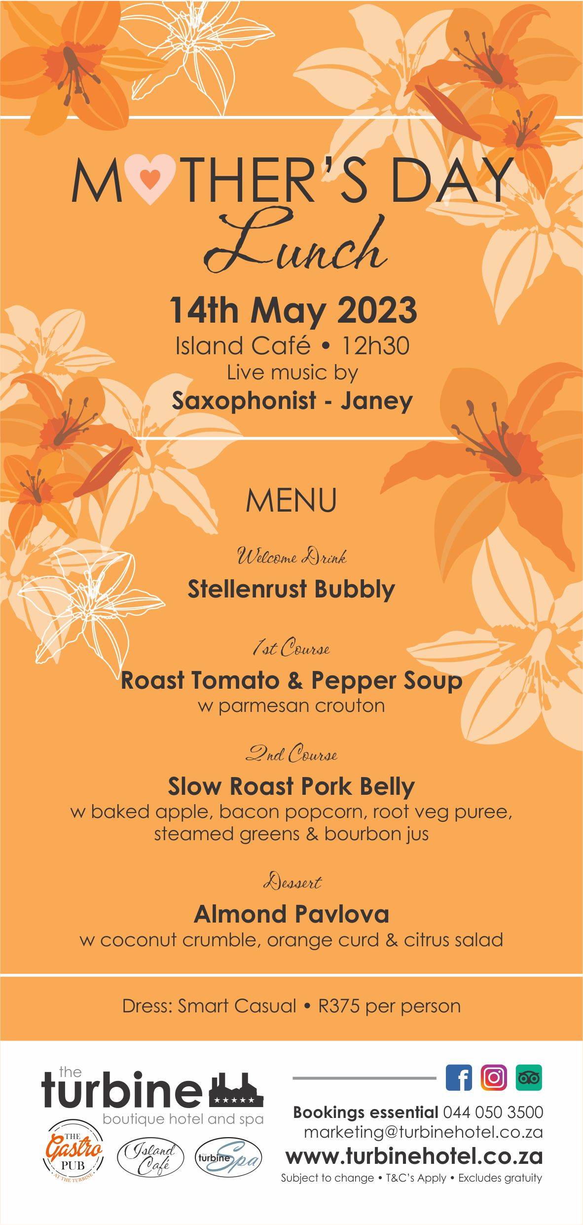 - Bookings for this exclusive Mother’s Day lunch can be made by calling 044 050 3500 or emailing marketing@turbinehotel.co.za. Make sure to secure your spot early as seats are limited, and this event is expected to be a popular choice among locals and tourists alike.
