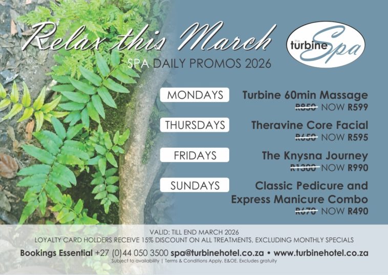 The Turbine Spa’s March specials are valid until the end of March 2026, offering several opportunities throughout the week to enjoy a discounted treatment. Regular guests also benefit from an additional perk — loyalty card holders receive 15% discount on all treatments, excluding monthly specials. Set against the peaceful surroundings of Thesen Islands, The Turbine Spa remains one of Knysna’s most inviting places to relax.