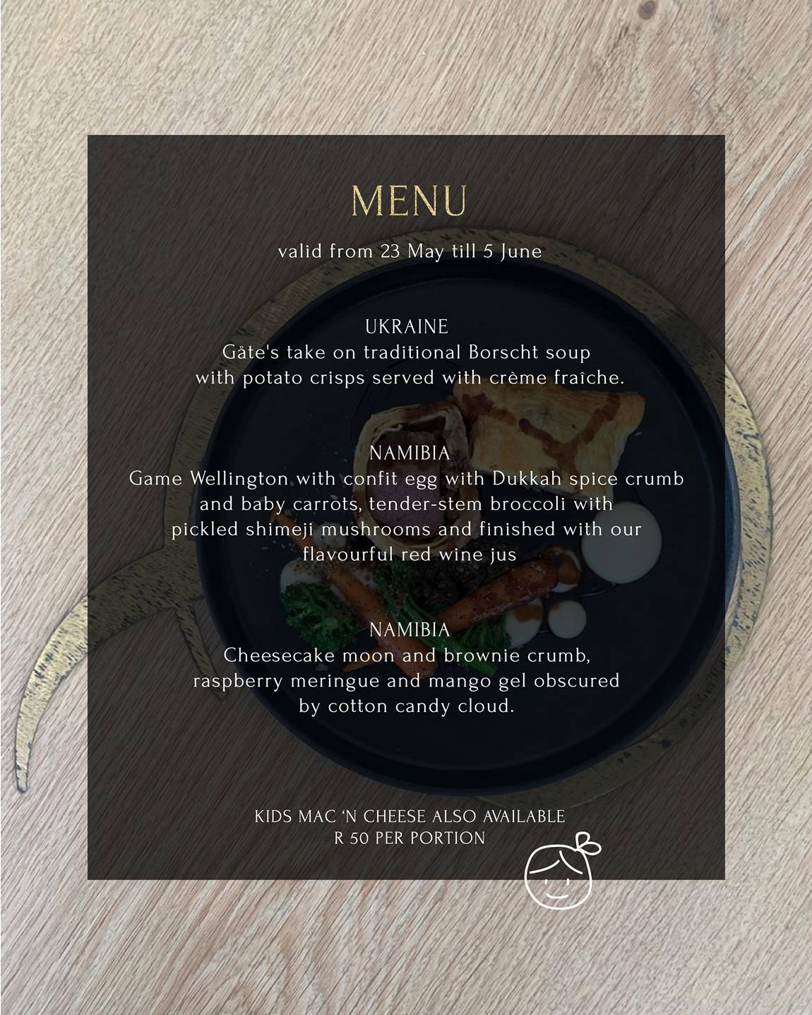 The full gourmet experience is R1400 per person. Kids Mac and Cheese also available at R50 for the little ones.