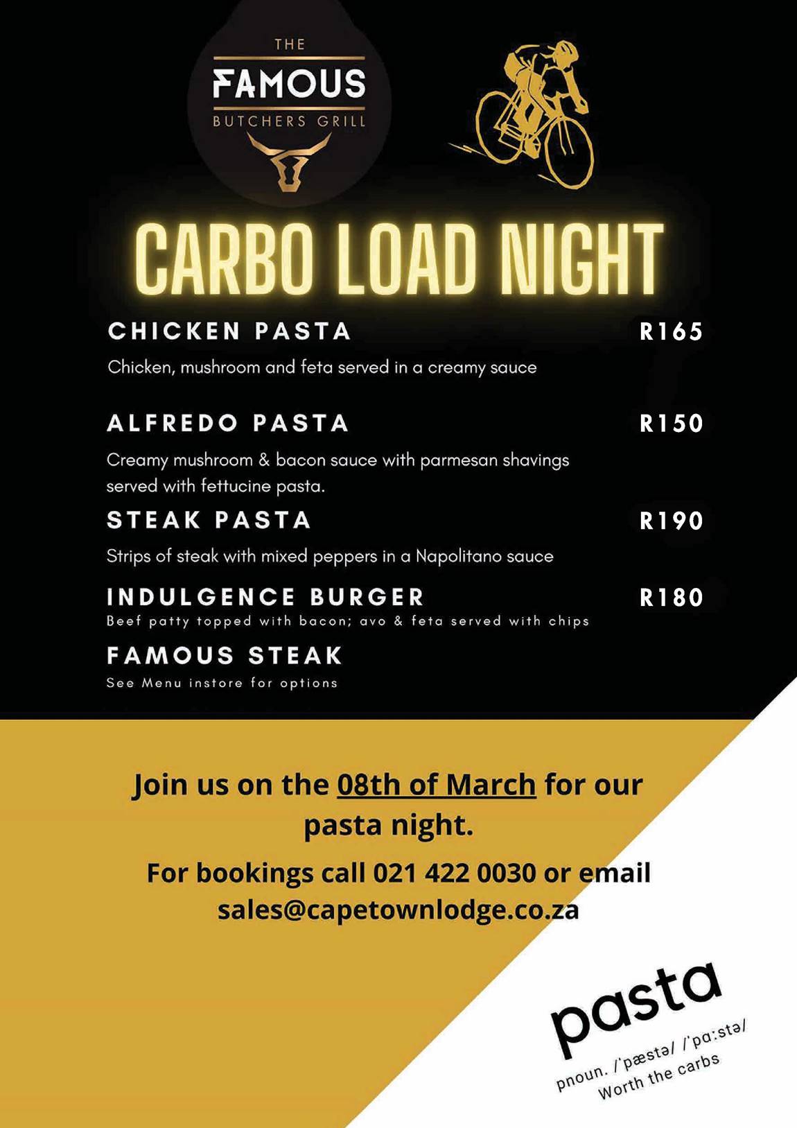 - Nestled in the heart of Cape Town, The Famous Butchers Grill is flipping the script on the traditional pre-race pasta binge with a Carbo Night Menu that’s as legendary as the race itself. Forget the sad spaghetti at home – this is a feast fit for champions (and those who just want an excellent excuse to eat their body weight in carbs).