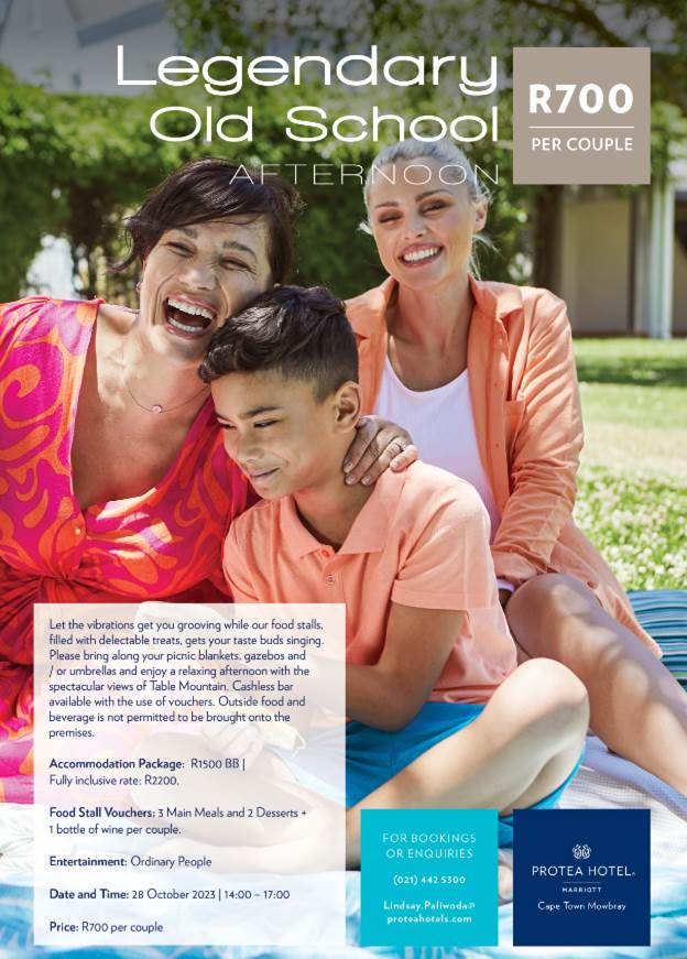 For R1500, guests can enjoy a comfortable night’s stay with breakfast, or for R2200, they can have the full inclusive experience, combining their stay with the event for an unforgettable weekend of music and nostalgia. Don’t miss out on this opportunity to relive the past while creating new memories at the Protea Hotel Mowbray’s Legendary Old School Experience.