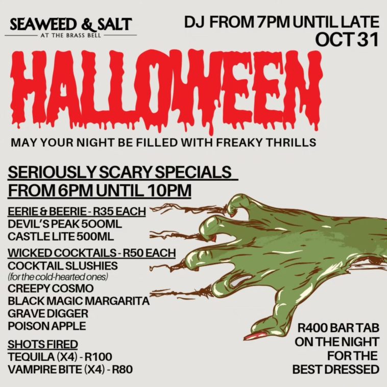 With a DJ spinning eerie beats from 7 PM until late, you’re in for a night of freaky thrills and killer tunes. This is your chance to drink, dance, and dare to scare at one of Cape Town’s most iconic spots. Make your way to Seaweed & Salt this Halloween for a night that promises to be wickedly unforgettable! Click here to book your table now!