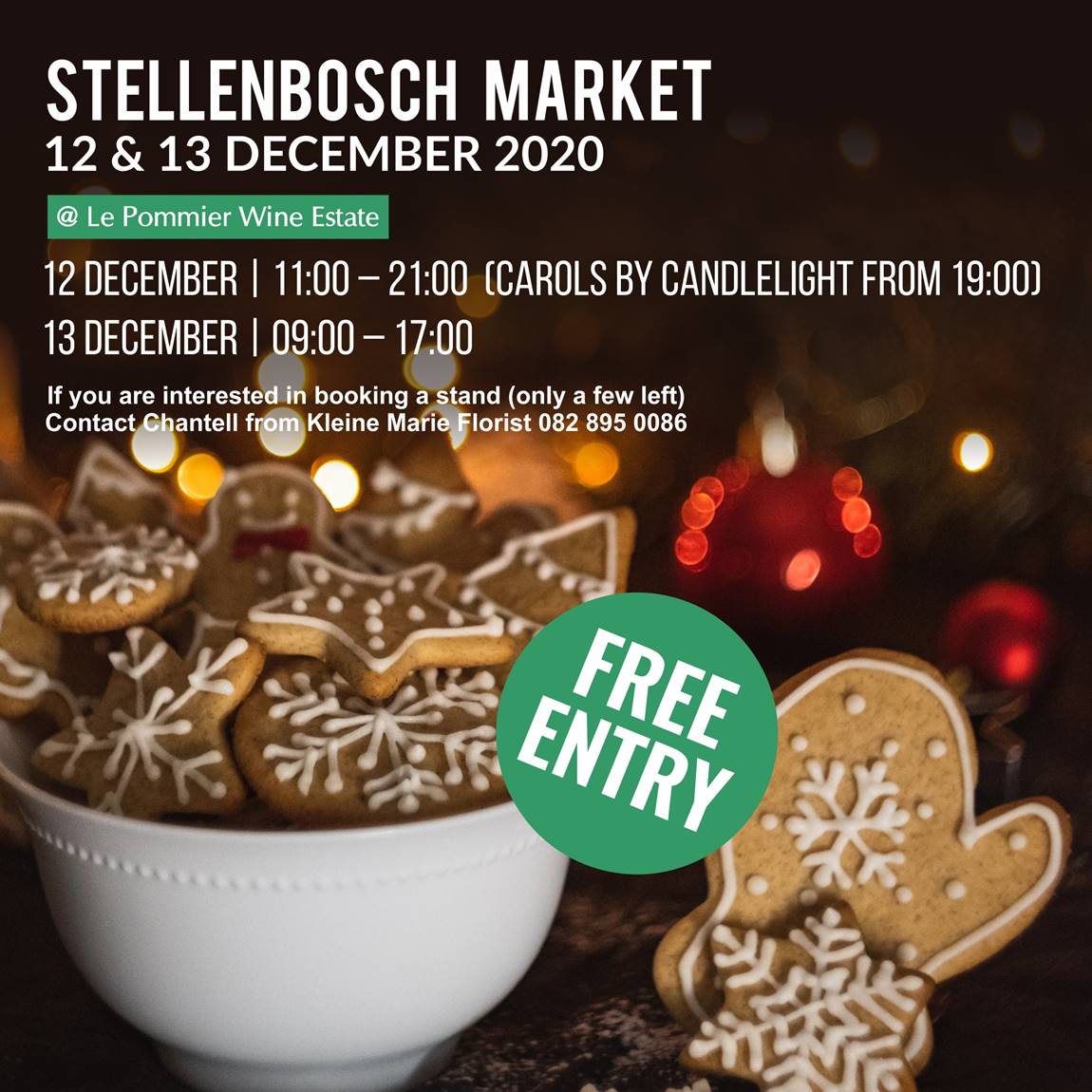 Come and play all day on the 12th of December from 11h00 – 21h00 with Carols by Candlelight starting at 19h00. The next day, join the market from 09h00 until 17h00 to get your Christmas shopping done early this year.