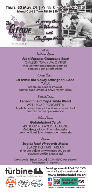 Turbine Hotel & Spa invites you to an exquisite Wine & Food Pairing event at the Island Cafe on Thursday, 30 May at 18:30 in Knysna.