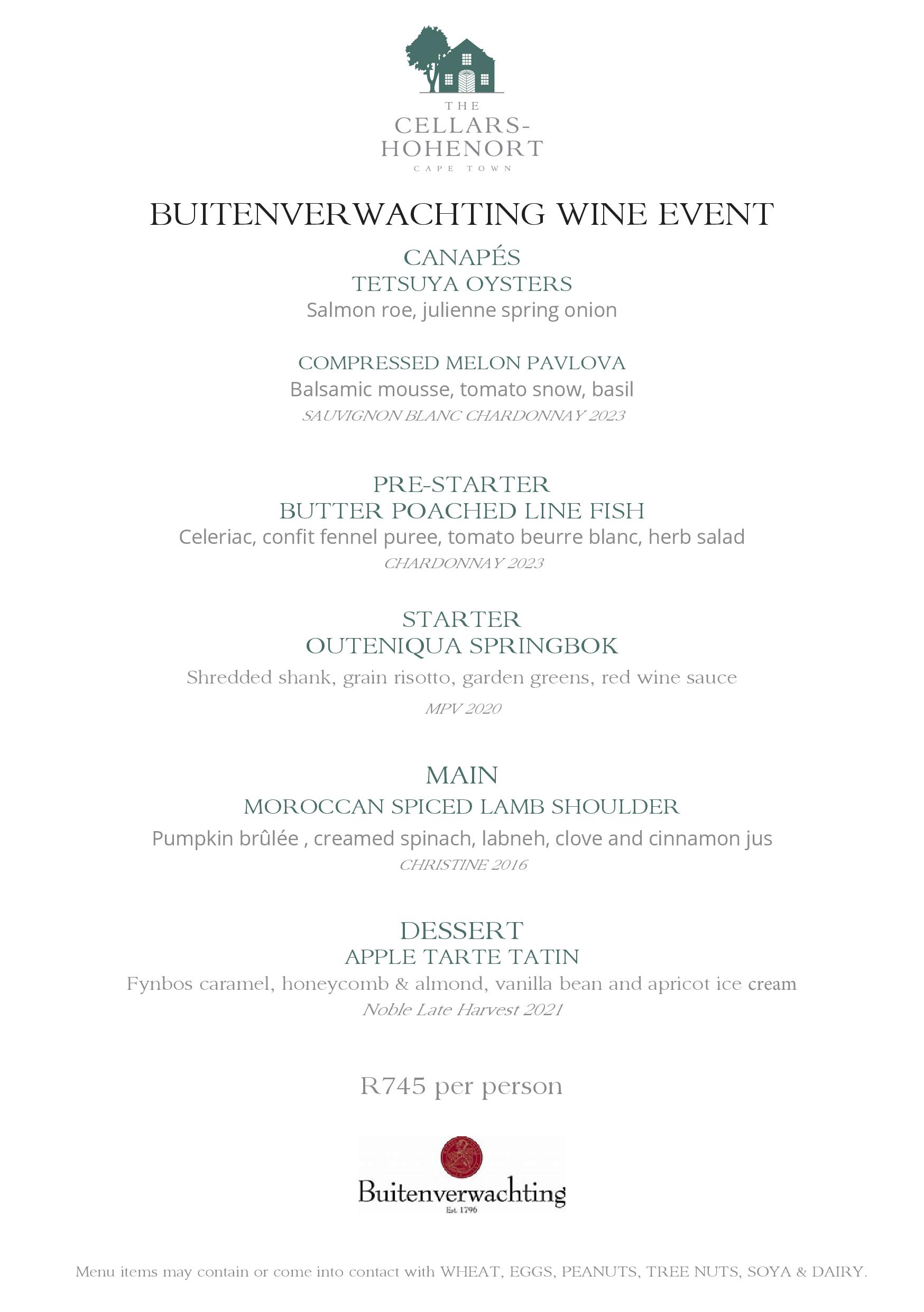The extravagant, multi-course feast will start with canapés of oysters; followed by compressed melon pavlova served with the welcome drink of Buitenverwachting’s Sauvignon Blanc Chardonnay blend (2023). The line fish course will be paired with the 2023 Chardonnay; followed by Outeniqua springbok enjoyed with the limited release 2020 MPV red blend. The hearty main course of Moroccan spiced lamb shoulder will meet its perfect match in the Bordeaux style blend of Cabernet Sauvignon and Cabernet Franc – Buitenverwachting Christine 2016; with a classic dessert of apple tarte tatin enjoyed with a glass of Noble Late Harvest 2021 to end festivities on a sweet note.