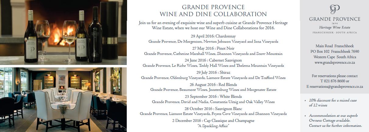 The Wine & Dine Collaboration dinners takes place at The Restaurant at Grande Provence every month, starting at 19h00. To book your seat at R695 per person, call Tel: 021 876 8600 or e-mail restaurant@grandeprovence.co.za.