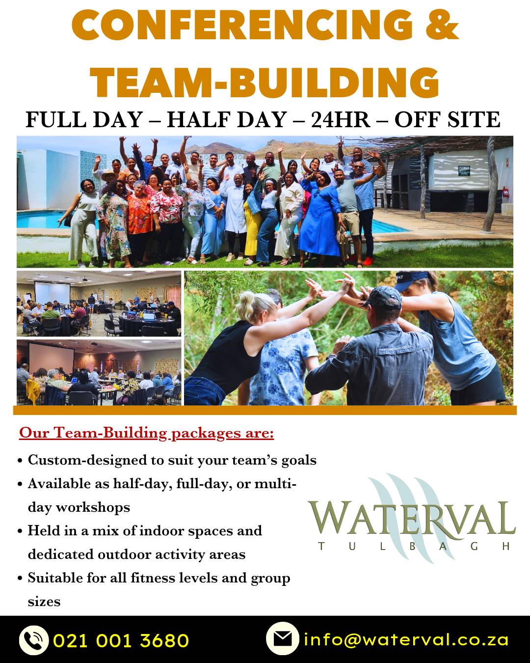 - Whether your team needs a quick reset or a full-on reboot, Waterval’s conferencing and team-building packages are custom-built to fit the mood. Half-day, full-day, or multi-day — however you roll, there’s a plan to match. Indoor brainstorms, outdoor obstacle courses, or fireside strategy sessions? Yes, yes, and yes.