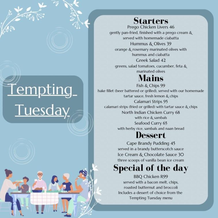 - The highlight of the menu is the Special of the Day: BBQ Chicken served with bacon melt, chips, roasted butternut, and broccoli, all for just R99. This special also includes a dessert of your choice from the Tempting Tuesday menu, such as Cape Brandy Pudding or classic Ice Cream & Chocolate Sauce.