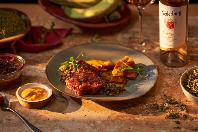 Served on a bed of lerotse purée, plantain chips with coconut atchar mousse, caramelised beans, morogo and lerotse chutney. Paired with Nederburg The Winemasters Grenache Carignan Rosé 2022
