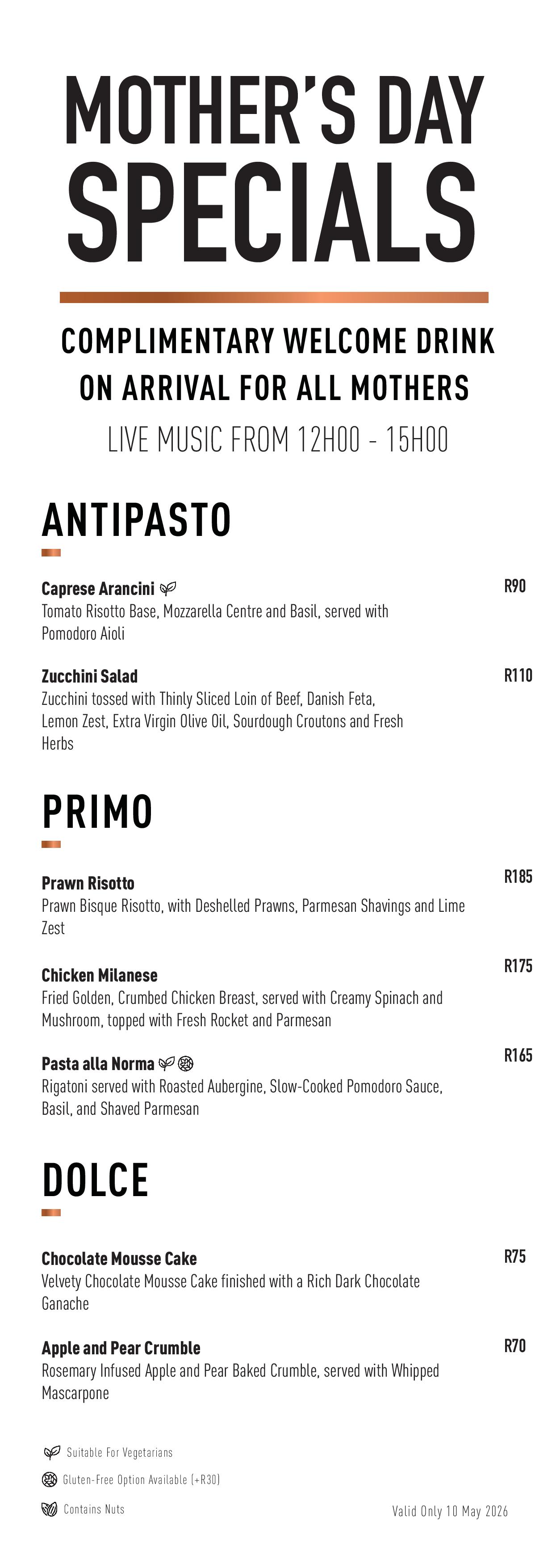 This year’s celebration keeps things simple but thoughtful, with a curated à la carte menu, a complimentary welcome drink for all mothers, and live music from 12h00 to 15h00.
