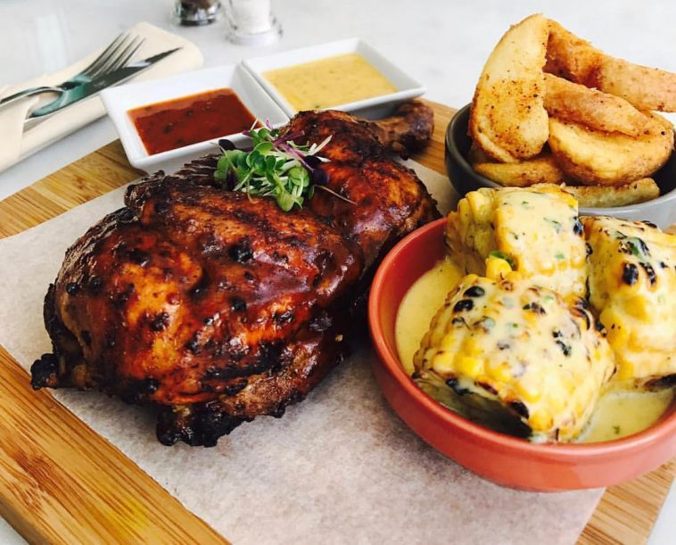 Half a chicken served with buttered corn and spicy potato wedges – at half the price (normal price: R215) AND accompanied by live music!