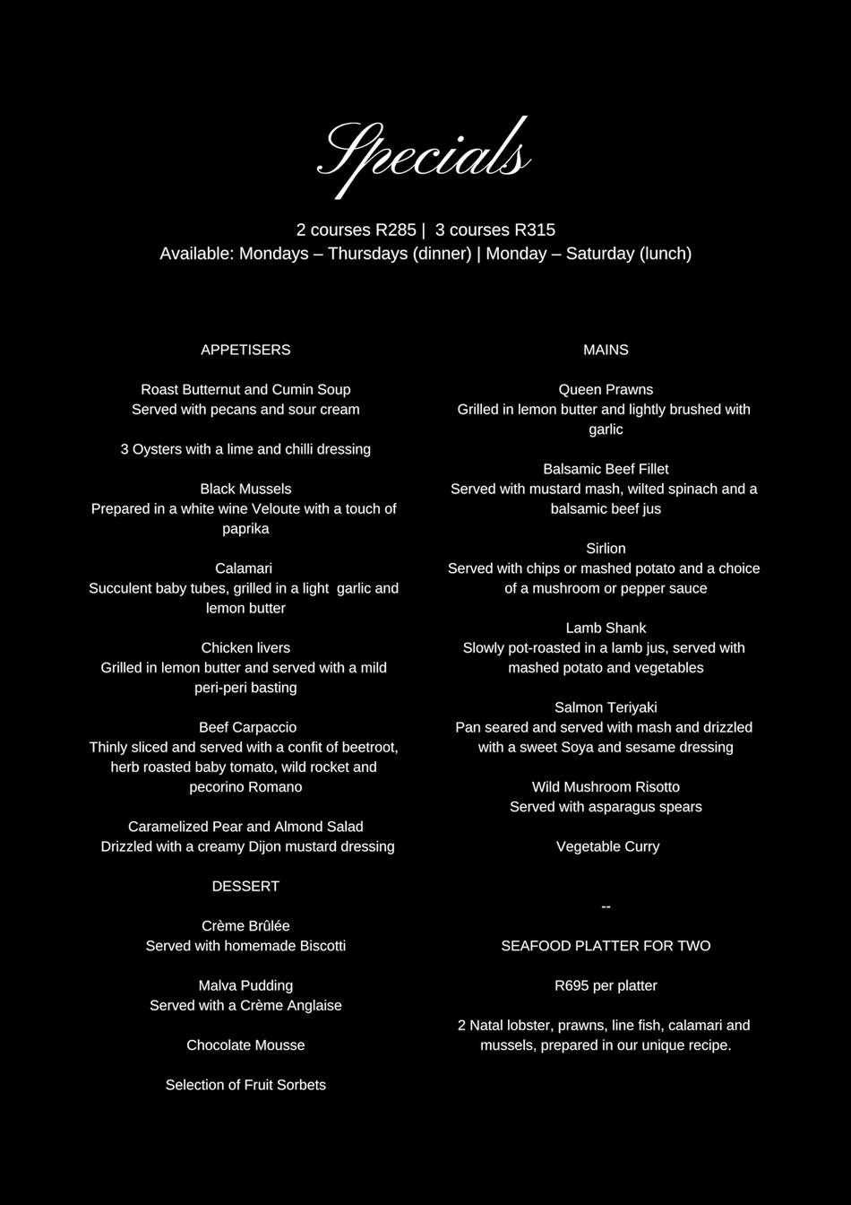 This set menu, which includes Queen Prawns grilled in lemon butter and lightly brushed with garlic and Wild Mushroom Risotto served with asparagus spears, also offers a recommended wine pairing for each dish. For example Black Mussels prepared in a white wine veloute with a touch of paprika paired with Paul Cluver Chardonnay and Beef Carpaccio thinly sliced and served with a confit of beetroot, herb roasted baby tomato, wild rocket and pecorino paired with Rupert and Rothschild Classique. The menu ends on a sweet note with classic desserts including Crème Brûlée served with homemade biscotti, Malva Pudding served with a crème anglaise and decadent Chocolate Mousse. [see full menu]
