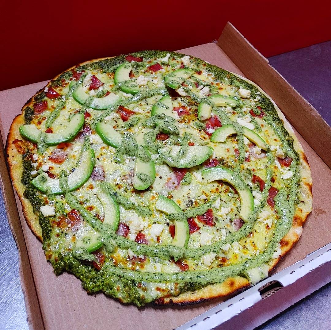 It consists of a pesto base, mozzarella cheese, bacon, feta and avo.