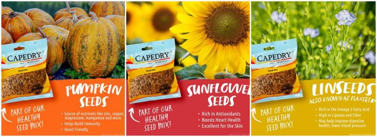 We especially love the Cape Dried Fruit Seed Mix with consists of 3 of the most nutritious seeds you can consume: sunflower seeds, pumpkin seeds and flaxseeds, also known as linseeds: