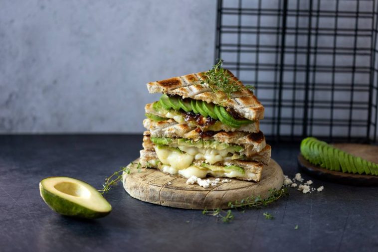 - Butter the bread slices. Top 4 of the slices with mozzarella, avo (seasoned with salt and pepper), caramelised onion, feta and thyme.