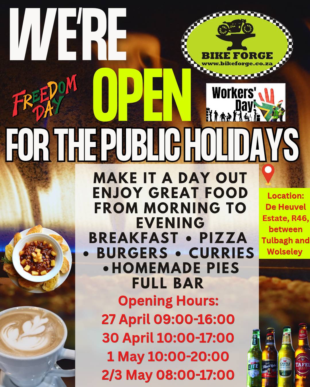 Open across key dates including Freedom Day and Workers’ Day, The Bike Forge keeps things simple: good food, relaxed vibes, and hours that give visitors plenty of time to settle in.
